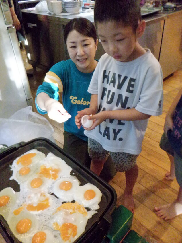 2日目は朝ラジオ体操から始まり、自分たちで目玉焼きを作って、風鈴づくりを行いました。可愛い風鈴が出来ましたよ♪