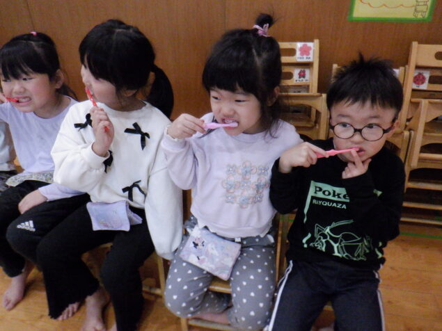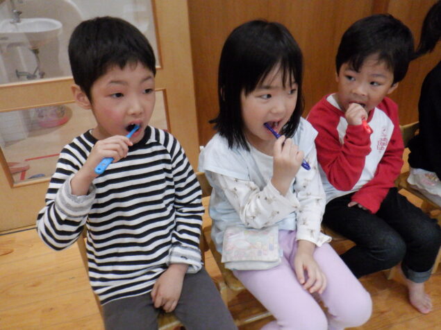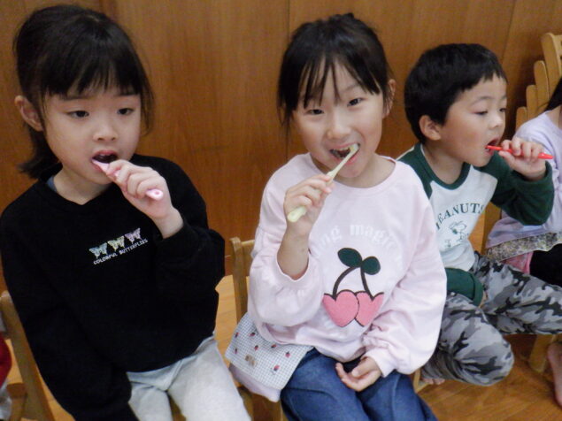 今年度、2回目の歯科検診!検診の前に各クラスでは、大きく口を開ける練習!たいよう組さん(5歳児)は、今回も保育士による歯磨きの大切さを知る時間を作りました。歯についてのクイズを楽しんだ後は、歯の模型を使って歯ブラシの使い方を学びました。そして、実際に歯磨き!お手本を見ながら丁寧に磨いていましたよ♪