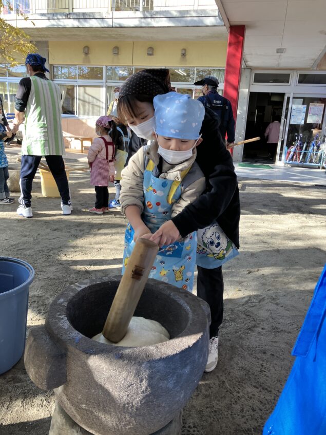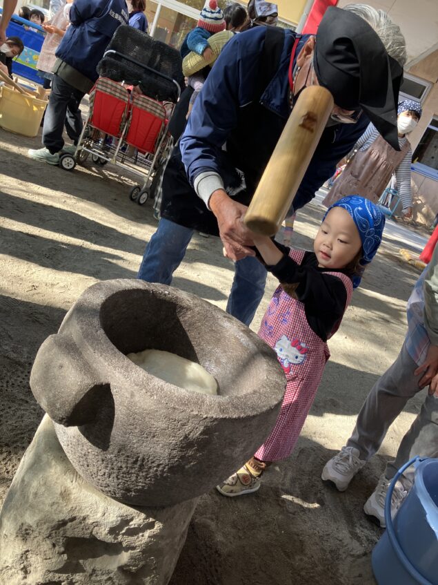 よく晴れた冬空のもと、もちつき会を行いました。民生委員の方にもお手伝いいただき「よいしょ~!よいしょ~!」とおもちをつきました。