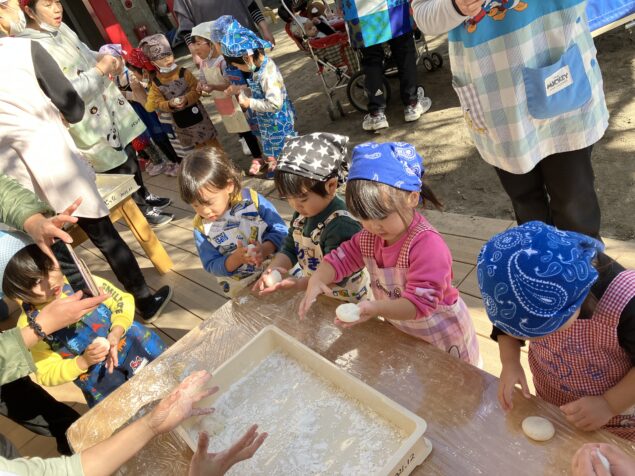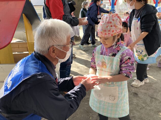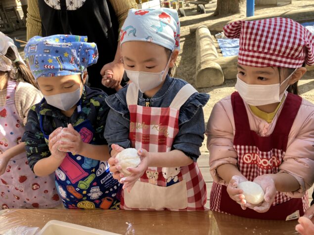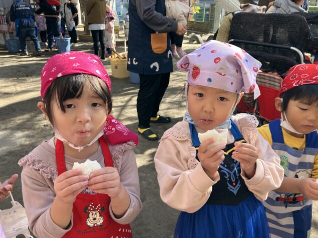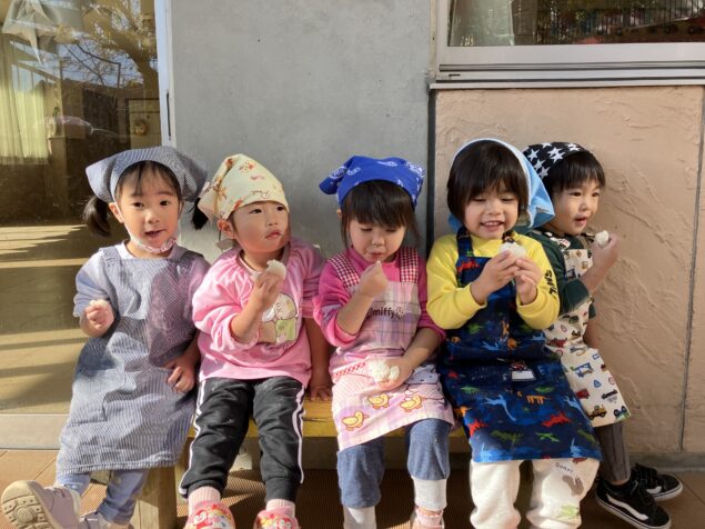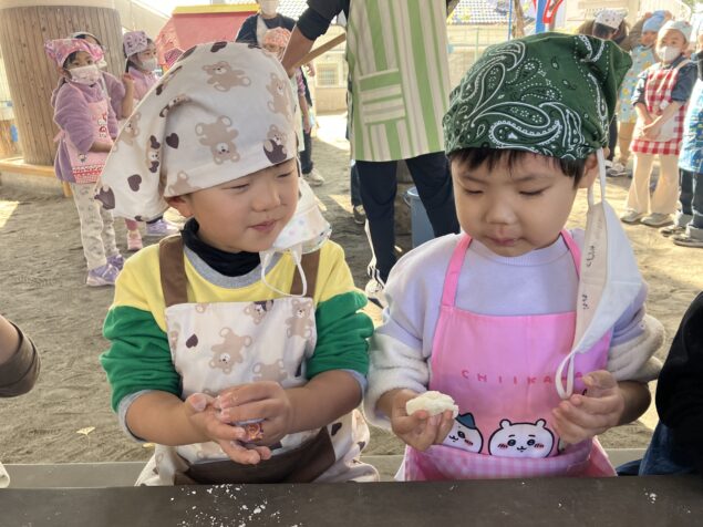 蒸したてのもち米を試食すると「もちもちしてる!」と、いつも食べているお米との食感の違いを感じる子どもたちでした。おもちを上手に丸めてみんなで試食をすると柔らかく、「おいし~い!」と喜ぶする姿があり、おいしくいただく子どもたちでした(^^♪