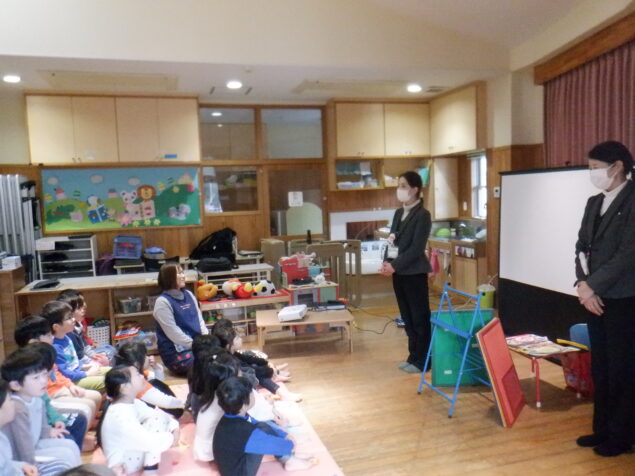 かぜ組、たいよう組(4,5歳児)を対象に鹿児島市安心安全課の安全教育指導員の方々にお越しいただき、防犯教室を行いました。“いかのおすしパネル”や赤ずきんちゃんのDVDを見ながら、危険な場面に遭遇した際にどのように対応したらよいかを、楽しく学ぶことが出来ました。