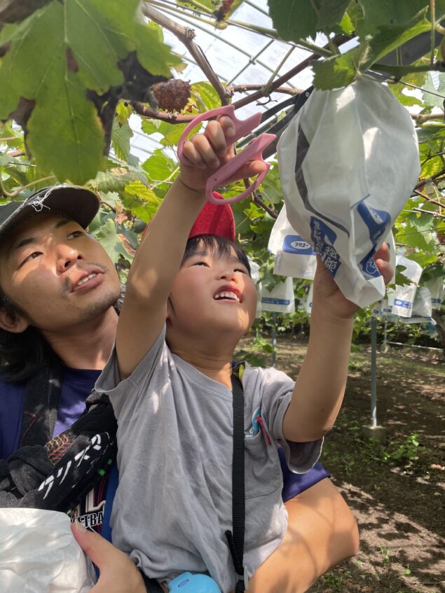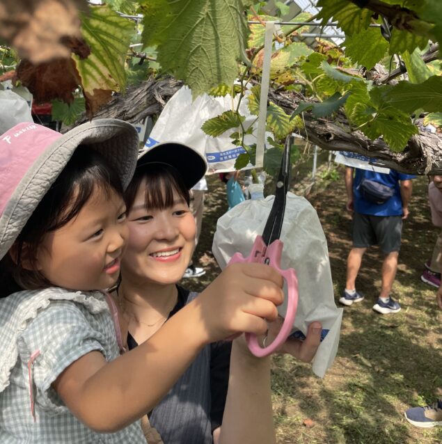 バスの中では、バスでのお約束やぶどうの話をしっかり聞くことができていたうさぎ組さん🐰こどもたちもドキドキ・ワクワクで待っている姿がありました。ぶどう農園に着くと、たくさんのぶどうに大喜び!!はぎいわさんのお話も聞き、試食もたくさんして、、、いざ!!ぶどう狩り!!大きいぶどうを探して~はさみでチョキン!!保護者の方が子どもたちを抱えて子どもたちが上手にはさみを使ってぶどう狩りをすることができました😊