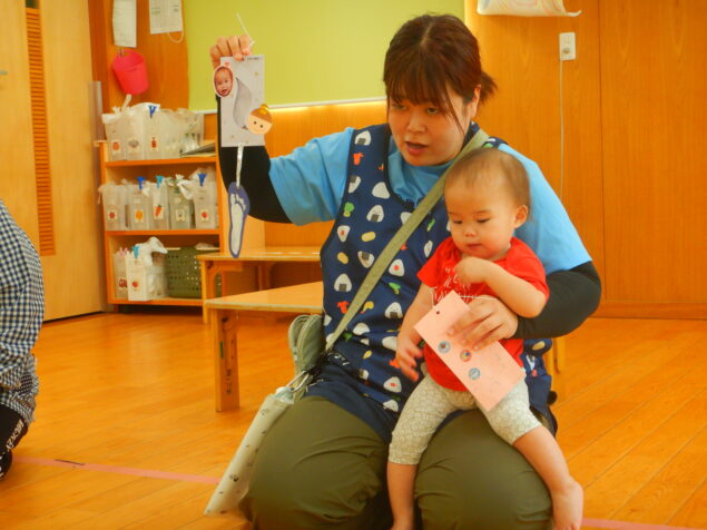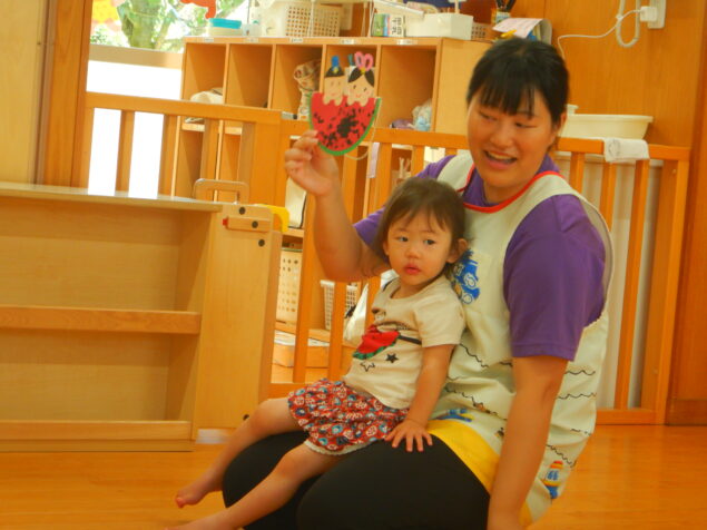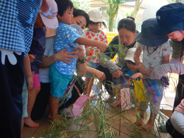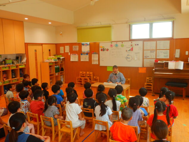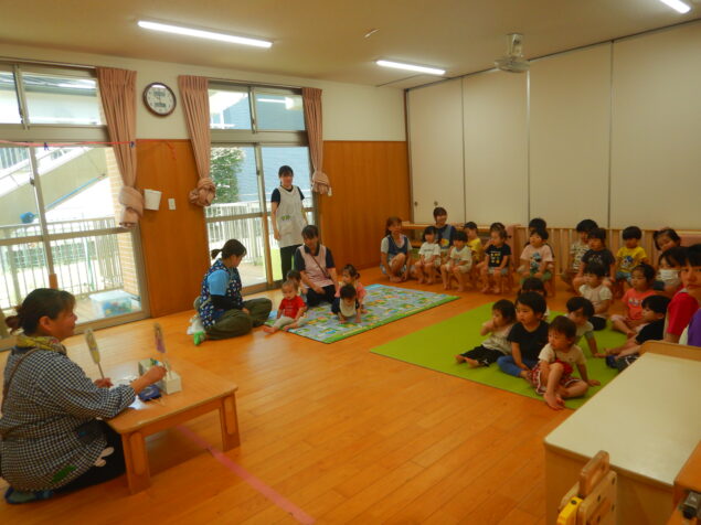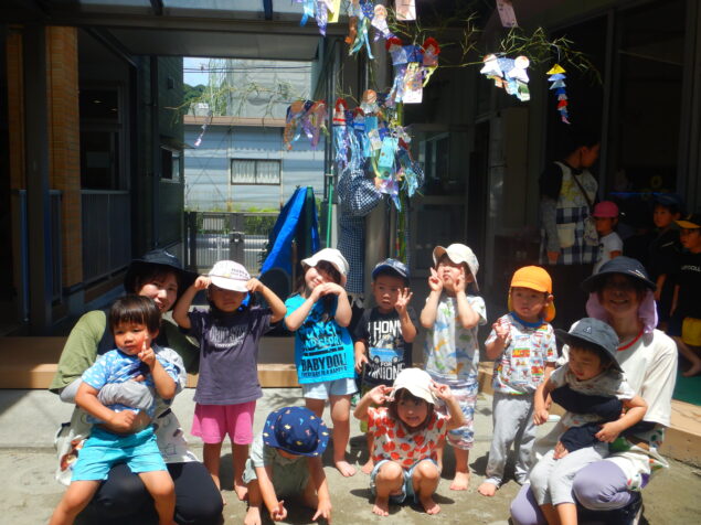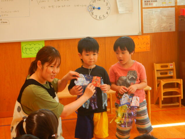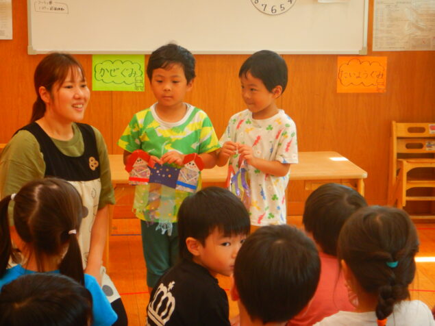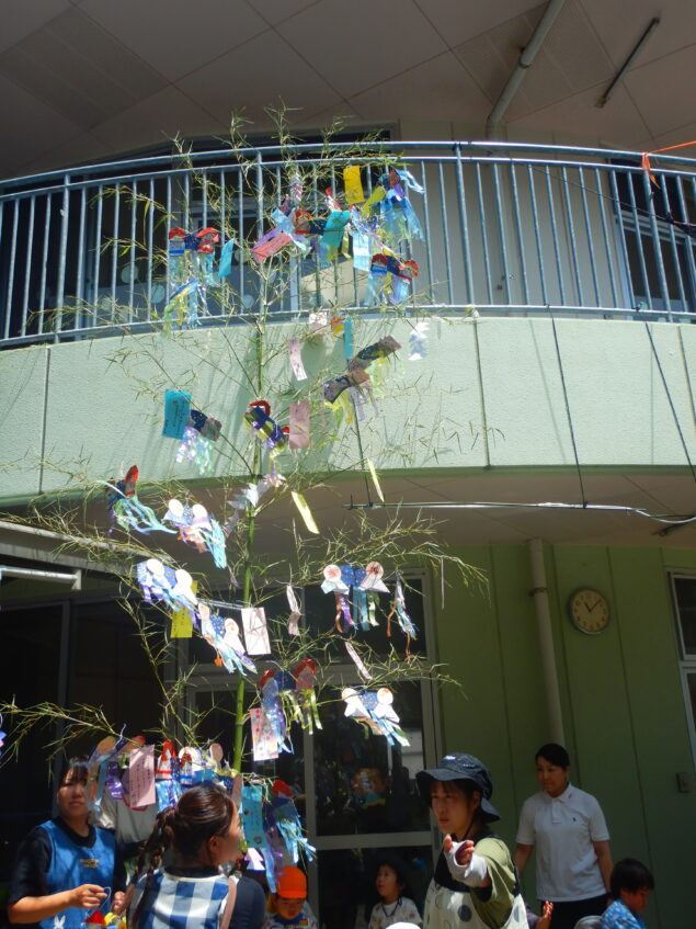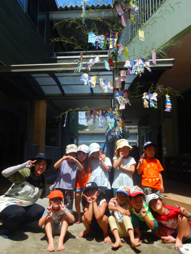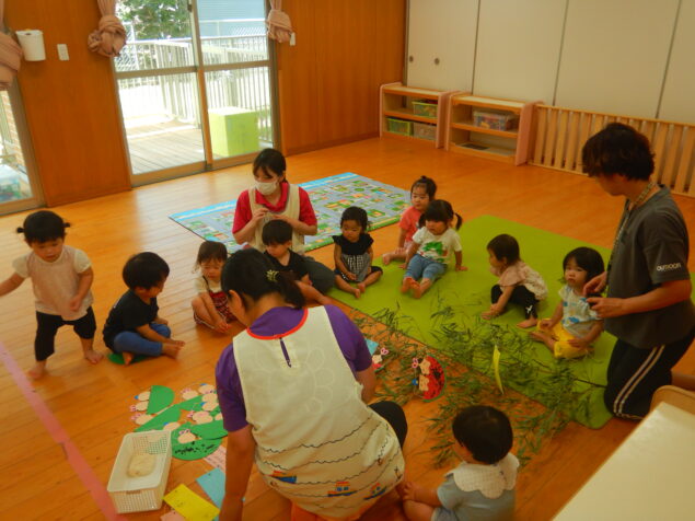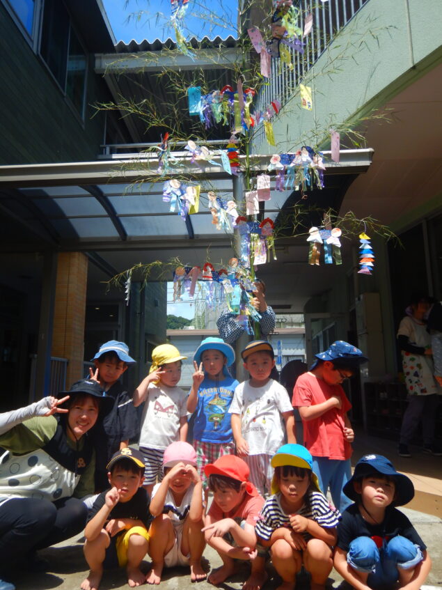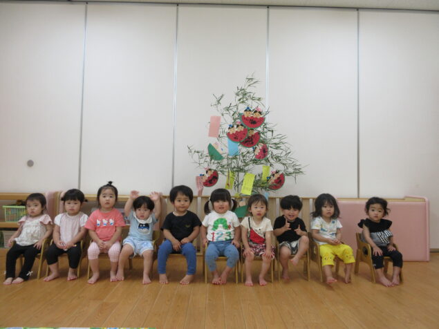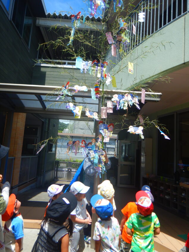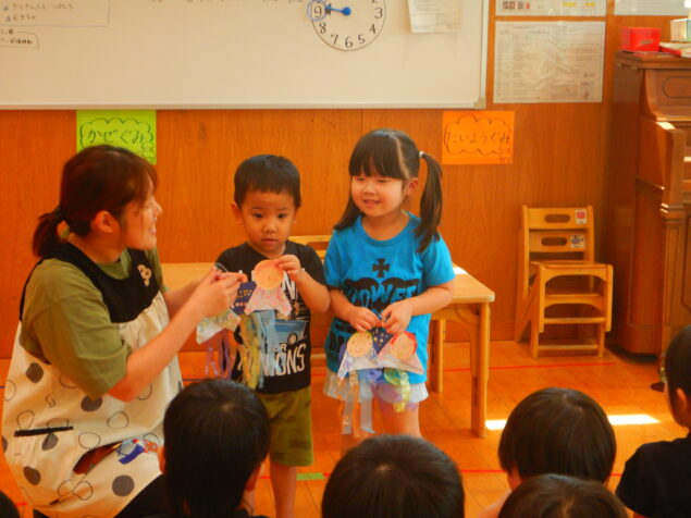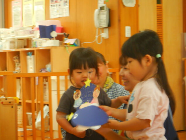 うみGとそらGに分かれて行い、七夕の由来についてのペープサートに始まり、子どもたちが一生懸命作った七夕飾りを各クラスで紹介し合いました。