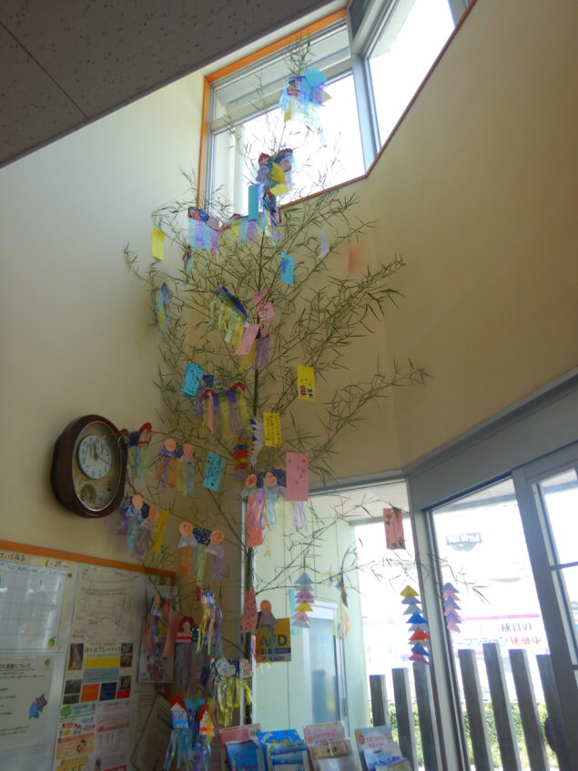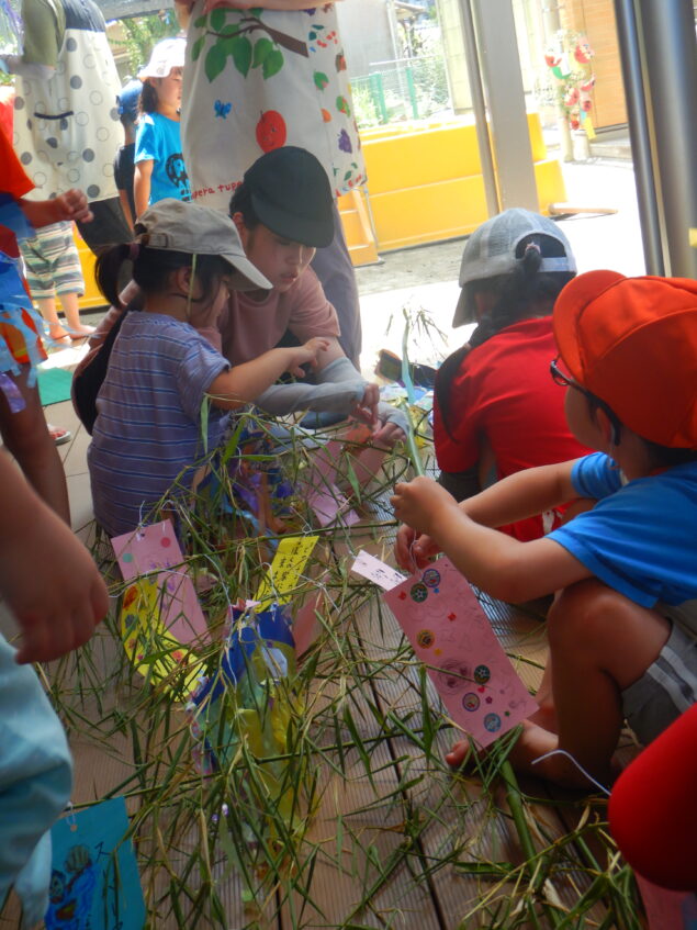 そらGはとっても大きな笹を玄関に飾り、大満足♬お迎えにいらしたお父さんやお母さんに「ほら、いっちばん上につけたよ」「すごいでしょ」と嬉しそうに話をする声が聞こえてきました☆