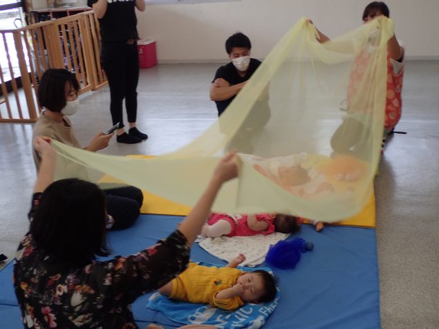 田崎先生の、優しく穏やかな言葉やわらべうたに合わせて、オーガンジー遊びや親子の触れ合い遊びが行われました。