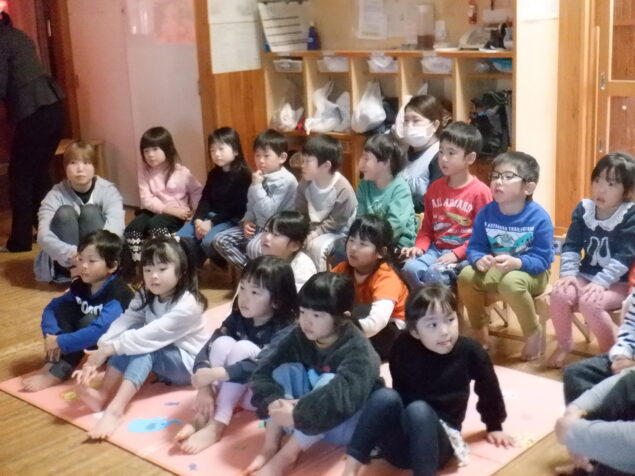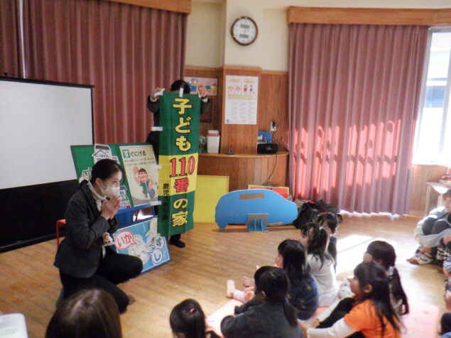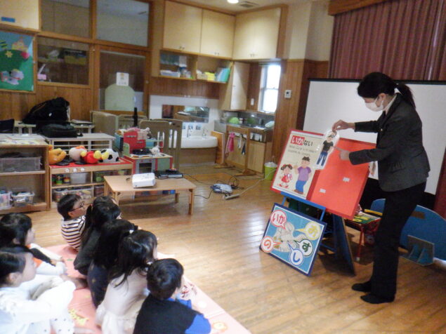 かぜ組、たいよう組(4,5歳児)を対象に鹿児島市安心安全課の安全教育指導員の方々にお越しいただき、防犯教室を行いました。“いかのおすしパネル”や赤ずきんちゃんのDVDを見ながら、危険な場面に遭遇した際にどのように対応したらよいかを、楽しく学ぶことが出来ました。
