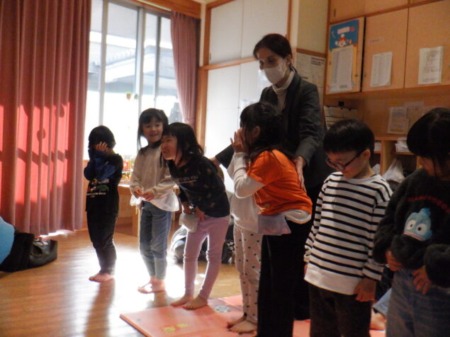 “いかのおすし”の合言葉の「いかない」では、指導員の方と子どもたちで実際の場面を想定して演じ、「行きません!」と大きな声で伝える練習をすることが出来ました!かぜぐみさん、たいよう組さんとても上手でした!